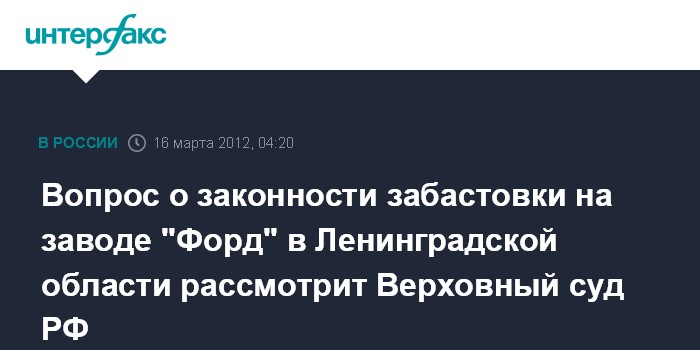 Москва. 16 марта. ИНТЕРФАКС - Верховный суд РФ обратится в пятницу к вопросу о законности ноябрьской предупредительной забастовки рабочих завода "Форд" в Ленинградской области.