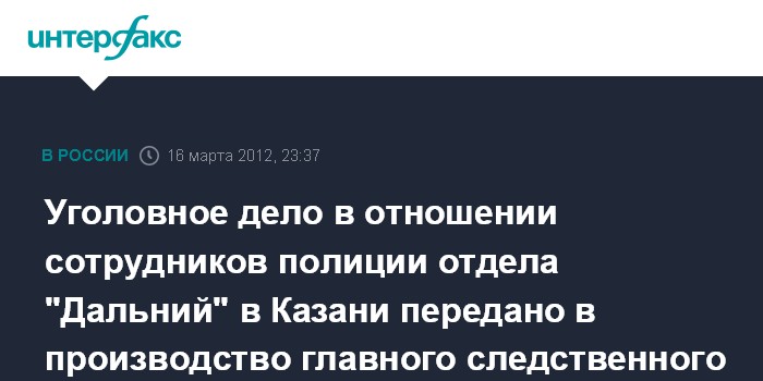 Москва. 16 марта. ИНТЕРФАКС - Уголовное дело в отношении сотрудников полиции отдела "Дальний" в Казани передано в производство ГСУ СК РФ, сообщил "Интерфаксу" в пятницу вечером официальный представитель ведомства Владимир Маркин.