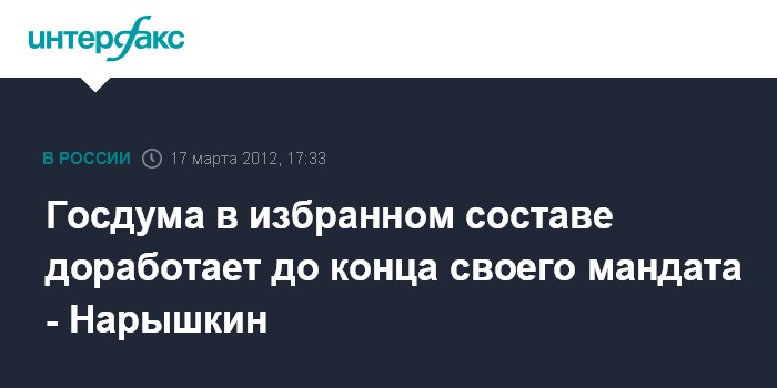 Владивосток. 17 марта. INTERFAX.RU - Досрочного переизбрания Госдумы не произойдет, заявил спикер Госдумы Сергей Нарышкин в интервью программе "Вести в субботу" с Сергеем Брилевым, транслировавшейся телеканалом "Россия-1" на Дальний Восток. "Государственная Дума шестого созыва будет работать в течение положенных Конституцией пяти лет", - заверил С.Нарышкин, подчеркнув, что для него другого решения нет. Он настаивает на независимости парламента, и "это объясняется новым этапом развития нашей страны".
