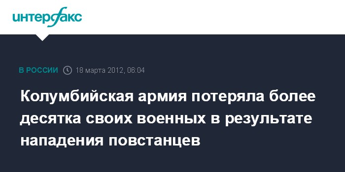 Лондон. 18 марта. ИНТЕРФАКС - Колумбийская армия сообщила о гибели 11 своих военнослужащих в результате нападения, совершенного боевиками леворадикальной повстанческой группировки "Революционные вооруженные силы Колумбии" (FARC).