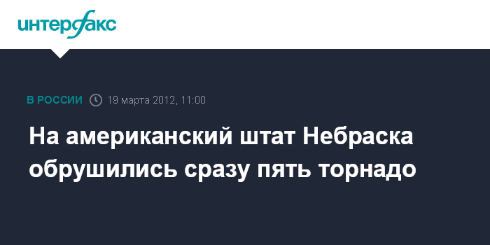 Вашингтон. 19 марта. INTERFAX.RU - Сразу пять торнадо обрушились на округ Линкольн в американском штате Небраска, сообщает в понедельник национальная метеорологическая служба США.