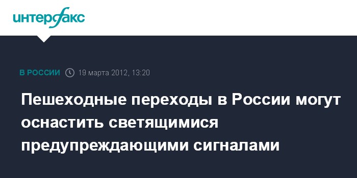 Москва. 19 марта. INTERFAX.RU - МВД РФ летом 2012 г. по итогам эксперимента решит вопрос об оснащении пешеходных переходов светящимися предупреждающими знаками, сообщил официальный представитель Главного управления обеспечения безопасности дорожного движения МВД Владимир Шевченко.