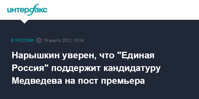 Москва. 19 марта. INTERFAX.RU - Спикер Госдумы Сергей Нарышкин считает, что фракция "Единая Россия" проголосует за кандидатуру Дмитрия Медведева на пост председателя правительства, если вновь избранный президент ее внесет на рассмотрение депутатов.