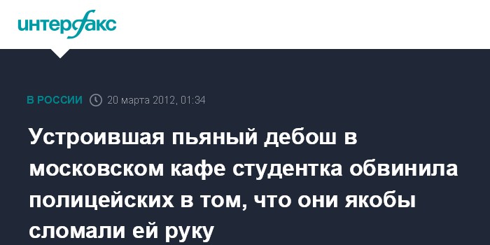 "Протрезвев через несколько часов, девушка, по всей видимости, позабыв про дебош в кафе, заявила врачам, что руку ей сломали сотрудники полиции. Соответствующая телефонограмма из больницы была сразу же направлена в органы внутренних дел. Незамедлительно по данной информации была назначена служебная проверка по линии отдела собственной безопасности и инспекции по личному составу, однако, по предварительным данным, никаких противоправных действий со стороны сотрудников полиции выявлено не было", - сообщили в пресс-службе.