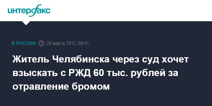 Житель Челябинска через суд хочет взыскать с РЖД 60 тыс. рублей за отравление бромом