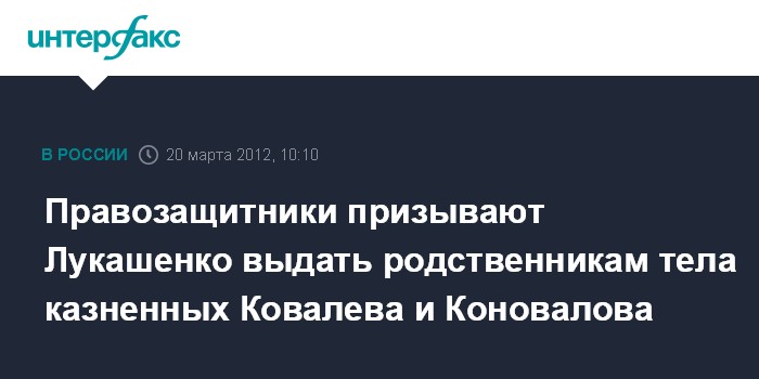 Лондон. 20 марта. INTERFAX.RU - Белорусские власти должны выдать родственникам для захоронения тела казненных недавно Владислава Ковалева и Дмитрия Коновалова, заявляет правозащитная организация "Международная амнистия".
