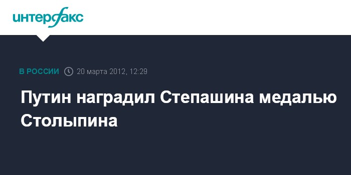 Москва. 20 марта. ИНТЕРФАКС - Премьер РФ Владимир Путин подписал распоряжение о награждении председателя Счетной палаты России Сергея Степашина медалью П.А.Столыпина II степени.