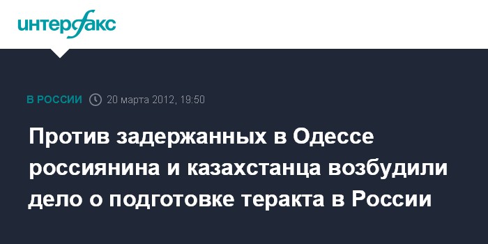 Киев. 20 марта. INTERFAX.RU - В пресс-центре Службы безопасности Украины подтверждают информацию о том, что следственным управлением СБУ возбуждено уголовное дело в отношении гражданина России и гражданина Казахстана, задержанных в конце января - в феврале в Одессе по подозрению в подготовке теракта на территории РФ.