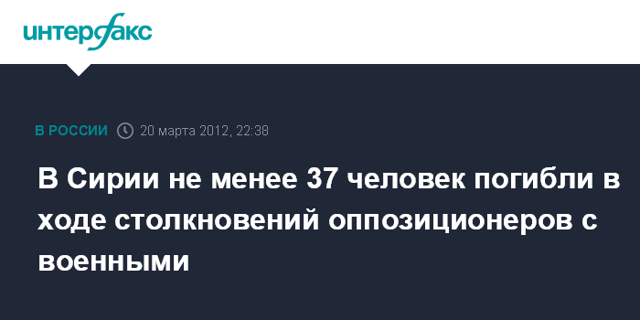Каир. 20 марта. INTERFAX.RU - По меньшей мере 37 человек, включая двух женщин и двух детей, были убиты во вторник в Сирии в результате столкновений оппозиционеров с силами безопасности, сообщают сирийские оппозиционные координационные комитеты. Большинство жертв приходится на города Хомс и Хама.