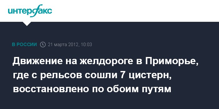 Хабаровск. 21 марта. INTERFAX.RU - Движение поездов на участке Губерово - Сибирцево в Приморском крае, где утром в среду с рельсов сошли семь цистерн с нефтепродуктами, осуществляется по обоим путям на тепловозной тяге, сообщила пресс-служба ДВЖД.