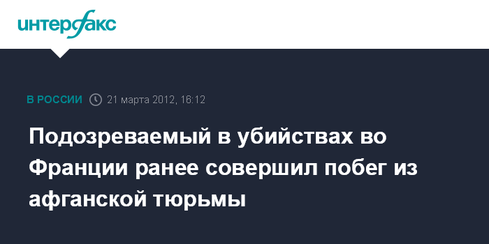 Париж. 21 марта. INTERFAX.RU - Подозреваемый в убийствах на юге Франции Мухаммед Мера ранее сбежал из тюрьмы в афганском городе Кандагар, сообщил в среду интернет-сайт французской газеты "Монд".