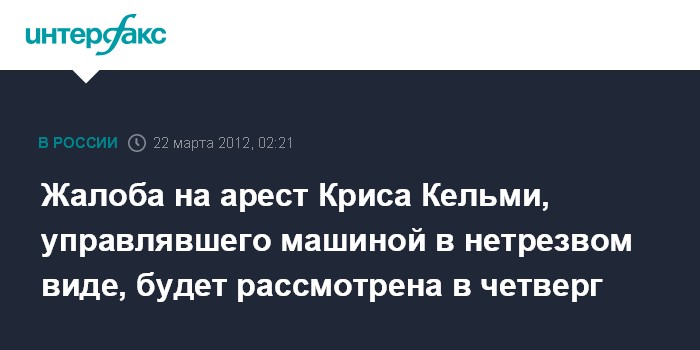 Жалоба на арест Криса Кельми, управлявшего машиной в нетрезвом виде, будет рассмотрена в четверг