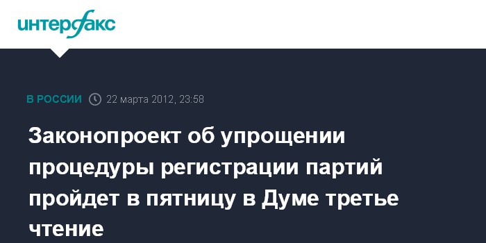 Москва. 22 марта. INTERFAX.RU - Госдума в пятницу рассмотрит в третьем, окончательном, чтении президентский законопроект, упрощающий процедуру регистрации партий. Для участия в пленарном заседании приглашены представители непарламентских партий и несистемной оппозиции.
