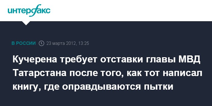 Москва. 23 марта. INTERFAX.RU - Член Общественной палаты России Анатолий Кучерена потребовал отставки главы МВД Татарстана Асгата Сафарова, который в своей книге фактически обосновал необходимость применения пыток подозреваемых. По его мнению, если сообщения СМИ с выдержками из этой книги соответствуют действительности, то такому сотруднику МВД, тем более занимающему руководящую должность, не место в полиции.