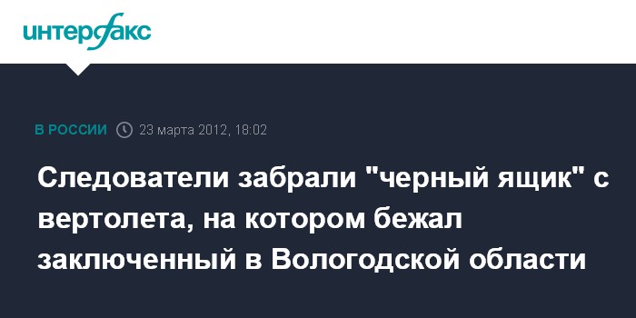 Вологда. 23 марта. INTERFAX.RU - Следователи изъяли "черный ящик" и другие предметы из вертолета, который заключенный в Вологодской области использовал для побега, сообщила "Интерфаксу" сотрудник пресс-службы областного следственного управления Наталья Летенкова.