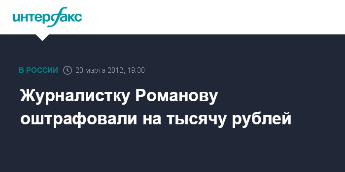 Москва. 23 марта. INTERFAX.RU - Мировой суд Пресненского района назначил наказание в виде штрафа 1 тыс. рублей журналистке Ольге Романовой - жене осужденного бизнесмена Алексея Козлова.