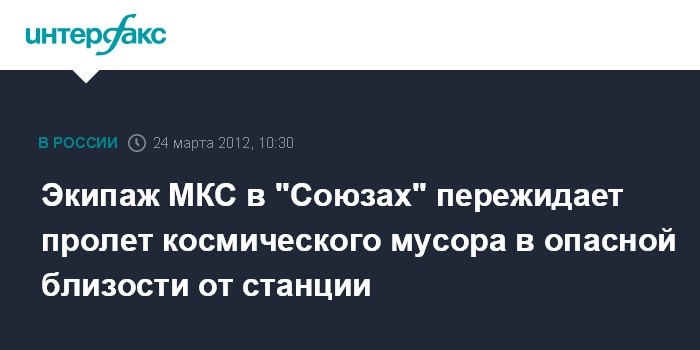Королев. 24 марта. INTERFAX.RU - Все члены экипажа Международной космической станции надели скафандры и укрылись в космических кораблях "Союз" в связи с угрозой возможного столкновения станции с фрагментом космического мусора, сообщили "Интерфаксу-АВН" в Центре управления полетами. "По расчетам баллистиков, обломок пролетит вблизи станции на минимальном расстоянии примерно в 10:38 мск. Приняты меры предосторожности. Космонавты в скафандрах заняли места в кораблях "Союз", - сообщил представитель ЦУП.