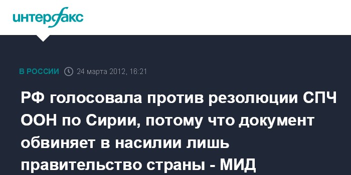 "23 марта Совет ООН по правам человека (СПЧ) по инициативе Евросоюза принял резолюцию по ситуации в области прав человека в Сирии. Документ дает одностороннюю оценку происходящего в стране, обвиняет в насилии только сирийское правительство, не содержит никаких требований в отношении вооруженных групп оппозиции. Игнорируются положительные результаты международных усилий по урегулированию кризиса, предпринимаемые в настоящее время в том числе со стороны Спецпосланника ООН и Лиги арабских государств Кофи Аннана", - говорится в сообщении, размещенном на сайте российского внешнеполитического ведомства.