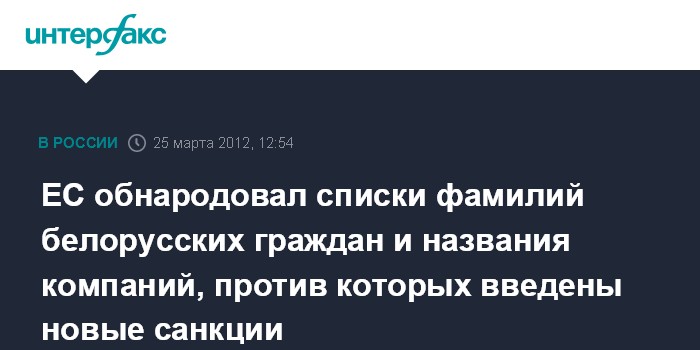 Минск. 25 марта. INTERFAX.RU - Печатный орган Евросоюза обнародовал фамилии 12 белорусских граждан и названий 29 компаний, чей въезд в ЕС запрещен и чьи активы на территории стран союза должны быть заморожены, сообщают в воскресенье белорусские Интернет-СМИ.