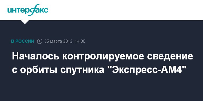 Париж. 25 марта. INTERFAX.RU - Российский телекоммуникационный спутник "Экспресс-АМ4", выведенный в августе прошлого года на нерасчетную орбиту, в воскресенье начал контролируемый сход с околоземной орбиты.