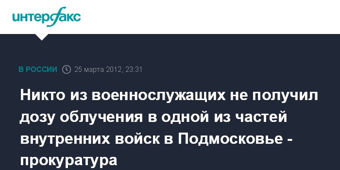 Москва. 25 марта. ИНТЕРФАКС - На территории одной из воинских частей внутренних войск в Подмосковье выявлен небольшой участок земли с радиоактивным загрязнением, никто из военнослужащих не получил дозу облучения, заявили "Интерфаксу" в пресс-службе Главной военной прокуратуры.