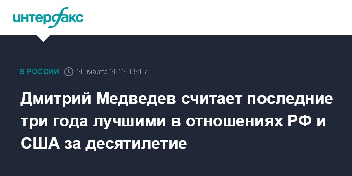 Сеул. 26 марта. INTERFAX.RU - Президент РФ Дмитрий Медведев считает, что, несмотря на различные оценки "перезагрузки", прошедшие три года стали лучшими во взаимоотношениях РФ и США за последние десять лет.