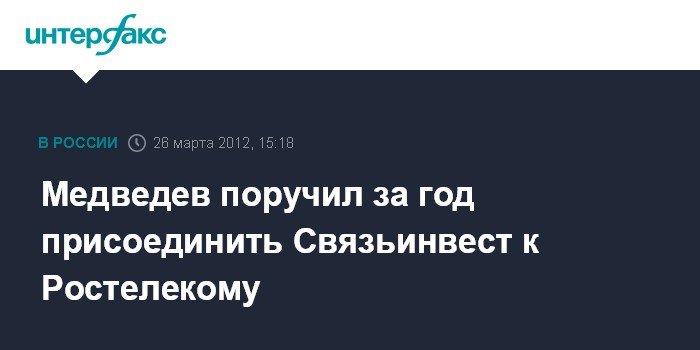 Москва. 26 марта. INTERFAX.RU - Президент РФ Дмитрий Медведев поручил правительству в течение 12 месяцев обеспечить реорганизацию ОАО "Ростелеком" путем присоединения к нему ОАО "Связьнвест". Соответствующий указ президента подписан 26 марта.