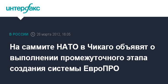 Москва/Брюссель.26 марта. INTERFAX.RU - На саммите НАТО в Чикаго в мае 2012 года будет объявлено о завершении промежуточного этапа создания системы евроПРО, заявил генсек Североатлантического альянса Андерс Фог Расмуссен.