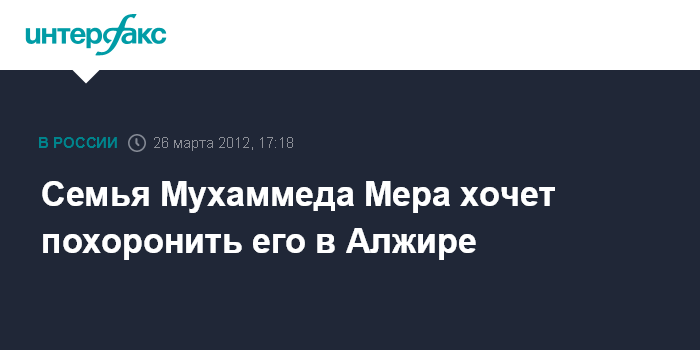 Париж. 26 марта. INTERFAX.RU - Родственники "тулузского стрелка" Мухаммеда Мера планируют провести церемонию похорон на его родине в Алжире, пишет в понедельник французская газета "Фигаро".
