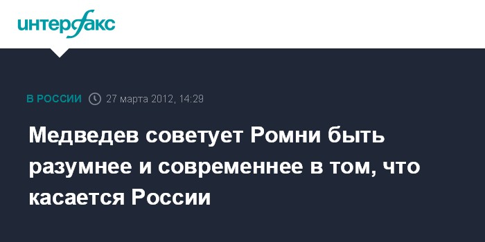 Комментируя на пресс-конференции в Сеуле заявление экс-губернатора Массачусэтса и кандидата в президенты от Республиканской партии Митта Ромни, Медведев посоветовал всем кандидатам в президенты США, которые делают подобные заявления, "включать доводы рассудка и следить за часами". "Сейчас не середина 70-х годов", - подчеркнул Медведев.