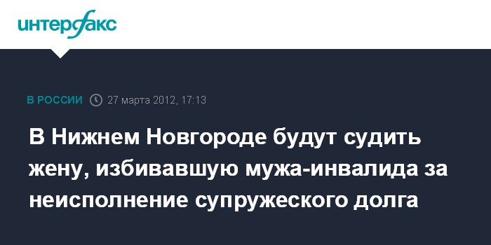 Нижний Новгород. 27 марта. INTERFAX.RU - Отдел полиции Московского района УМВД России по Нижнему Новгороду передал в суд уголовное дело по обвинению жены в избиении своего мужа - инвалида второй группы, страдающего с детства церебральным параличом.