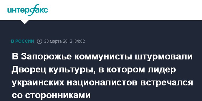 Как сообщает корреспондент агентства "Интерфакс - Украина", во вторник вечером в центре Запорожья около 300 сторонников Коммунистической партии Украины с красными знаменами и плакатами "Фашизм не пройдет!" штурмовали запорожский Дворец культуры "Орбита", где глава ВО "Свобода" О.Тягнибок встречался со своим электоратом.