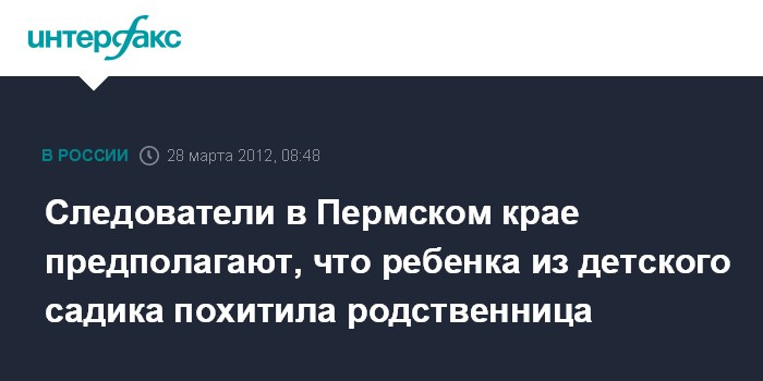 Как сообщил агентству "Интерфакс-Поволжье" представитель СУ СКР по Пермскому краю в среду, есть предположения, что девушка, которая увела из садика в Краснокамске мальчика, приходится ему родственницей. Отрабатывается несколько версий случившегося, в том числе и похищение ребенка с целью выкупа.