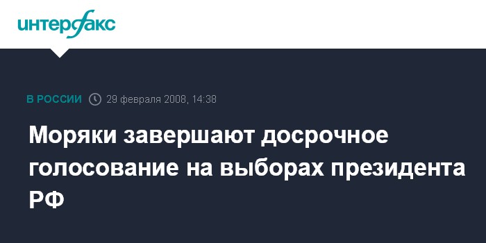 Москва. 29 февраля. INTERFAX.RU - В Военно-морском флоте России завершается досрочное голосование на выборах президента РФ военнослужащих отдаленных пунктов дислокации сил и войсковых частей, сообщил "Интерфаксу-АВН" в пятницу помощник главкома ВМФ капитан 1 ранга Игорь Дыгало.