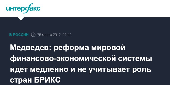 "Считаю, что залогом успеха проекта БРИКС может быть общность наших коренных интересов. Все мы заинтересованы в реформировании устаревшей финансово-экономической системы мира. Сейчас такое реформирование идет, но сегодня мы выразили недовольство тем, какими темпами это осуществляется, что отражено в проекте нашего заявления", - сказал Д.Медведев в четверг в Нью-Дели на заседании лидеров стран БРИКС в расширенном составе.