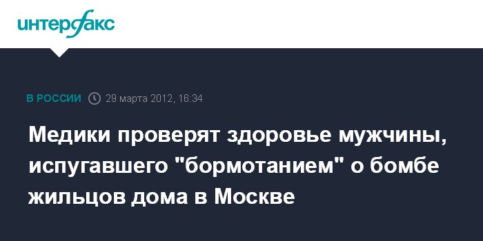 Москва. 29 марта. INTERFAX.RU - Задержан странный мужчина, "бормотавший" о бомбе в жилом доме на западе Москвы, сообщил "Интерфаксу" источник в правоохранительных органах.