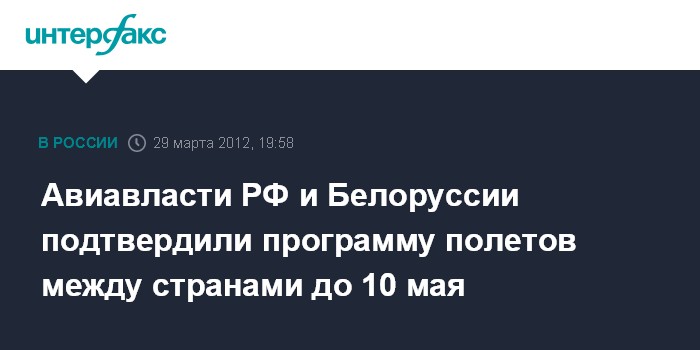 Москва. 29 марта. INTERFAX.RU - Авиавласти России и Белоруссии подтвердили назначенным авиакомпаниям обеих сторон программы полетов между пунктами двух стран до 10 мая 2012 года, говорится в сообщении Минтранса.