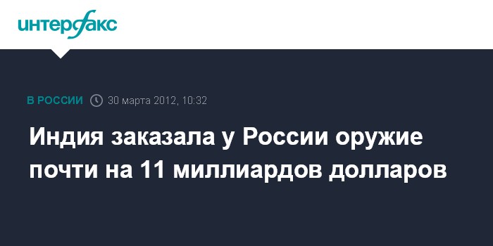Дели. 30 марта. INTERFAX.RU - Общий объем заказанного Индией в России вооружения и военной техники составляет $10,8 млрд, сообщил заместитель директора Федеральной службы по военно-техническому сотрудничеству Вячеслав Дзиркан.