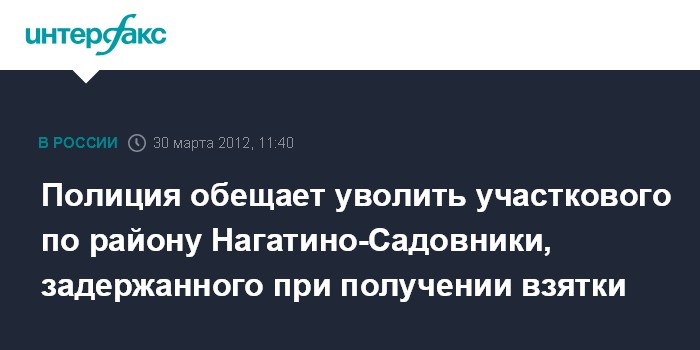 По словам источника, в конце января 2012 г. в УВД по ЮАО поступила информация о том, что участковый полиции отдела полиции по району Нагатино-Садовники вымогает 30 тыс. рублей у гражданина за не привлечение его к уголовной ответственности. В ходе проведения оперативно-розыскных мероприятий сотрудниками ОСБ УВД по ЮАО старший лейтенант был задержан с поличным при передаче денежных средств.