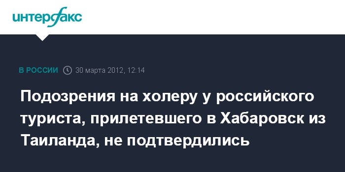 Москва. 30 марта. INTERFAX.RU - Медики не обнаружили холеру у российского туриста, который прилетел в Хабаровск из Таиланда, сообщил в пятницу "Интерфаксу" руководитель Роспотребнадзора, главный государственный санитарный врач РФ Геннадий Онищенко.