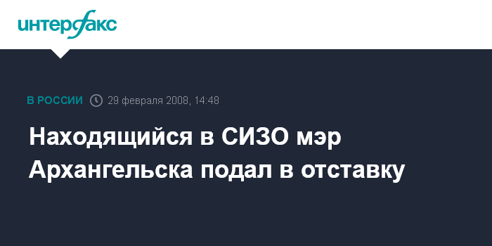 Архангельск. 29 февраля. INTERFAX.RU - Мэр Архангельска Александр Донской, находящийся под следствием и содержащийся в следственном изоляторе, подал в отставку.