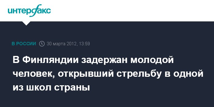 Хельсинки. 30 марта. INTERFAX.RU- Финские полицейские задержали 23-летнего молодого человека, открывшего стрельбу в школе города Оривеси на юге страны, сообщили в пятницу местные СМИ. "Он сделал несколько выстрелов в классную комнату через входную дверь, никто не был ранен. Подозреваемый задержан", - сказал начальник местной полиции Яри Киннунен.