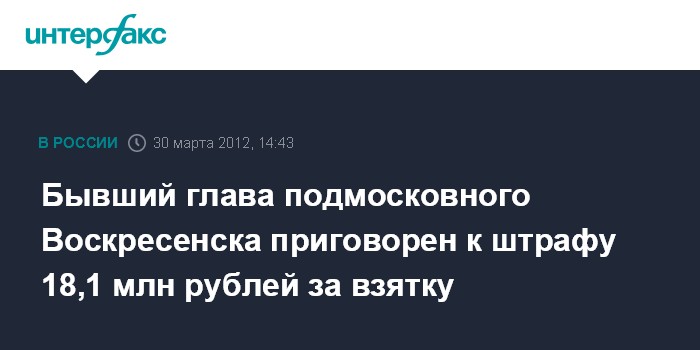 Бывший глава подмосковного Воскресенска приговорен к штрафу 18,1 млн рублей за взятку