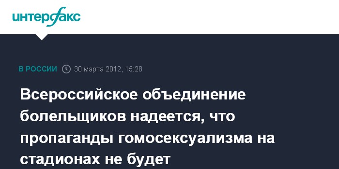 Москва. 30 марта. INTERFAX.RU - Всероссийское объединение болельщиков (ВОБ) полностью поддерживает инициативу ряда государственных деятелей по запрету пропаганды гомосексуализма среди несовершеннолетних. "Мы считаем, что реклама подобного образа жизни в общественных местах, учебных заведениях, на телевидении, а также повсеместное распространение этого явления в отдельных сферах деятельности, является настоящим позором для всей страны", - говорится в заявлении ВОБ, опубликованном на сайте организации в пятницу.