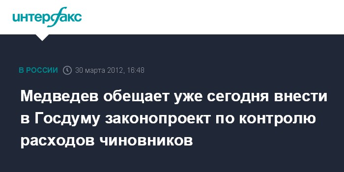 Горки. 30 марта. INTERFAX.RU - Президент РФ Дмитрий Медведев заявил, что в пятницу внесет в Госдуму законопроект по контролю за соответствием расходов госчиновников их доходам, и рассчитывает, что он будет принят в короткие сроки.
