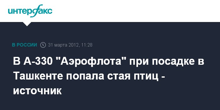 Москва. 31 марта. INTERFAX.RU - Пассажирский аэробус, следовавший из Москвы, столкнулся со стаей птиц при заходе на посадку в Ташкенте, сообщил "Интерфаксу" источник в "Аэрофлоте", которой принадлежит самолет.