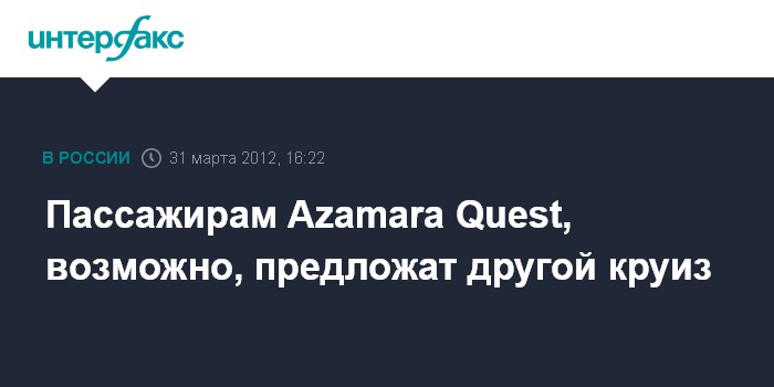 Москва. 31 марта. INTERFAX.RU - Владельцы круизной компании Azamara Cruises, которой принадлежит лайнер Azamara Quest, с которым произошла авария недалеко от Филиппин, приняли решение прервать совершение круиза, сообщается на официальном сайте круизной компании. Там говорится, что после того, как аварийный лайнер прибудет, ориентировочно в понедельник, в порт Сандакан (Малайзия), данный круиз будет прекращен. Туристам с этого судна могут предложить путешествие на другом лайнере, считают российские эксперты в туристической сфере.