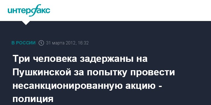 Москва. 31 марта. INTERFAX.RU - Московская полиция сообщает о задержании трех человек на Пушкинской площади в Москве в субботу.