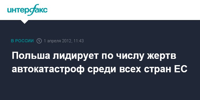 Варшава. 1 апреля. INTERFAX.RU - В Польше отмечается самое большое количество погибших в результате автокатастроф среди всех стран-членов Евросоюза.За последние десять лет количество жертв ДТП в государствах ЕС сократилось на 43%. В итоге было спасено около 125 тыс. жизней. Тем не менее, за этот же период число погибших в результате автокатастроф в Польше снизилось лишь на 29%. Более того, в 2011 году оно даже увеличилось на 7%.