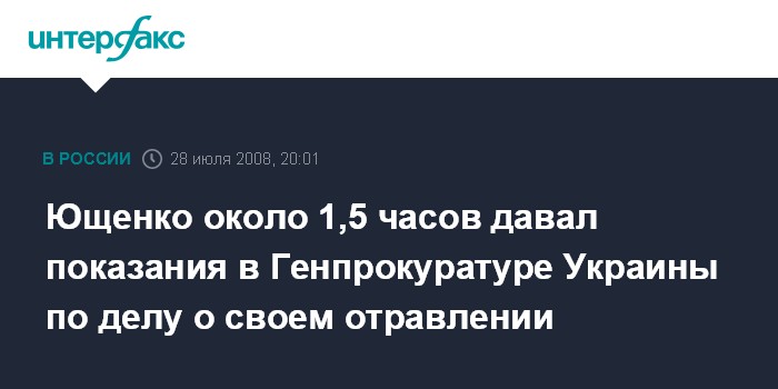 Как сообщает корреспондент агентства "Интерфакс-Украина", В.Ющенко около 1,5 часов давал показания по делу о своем отравлении следователю Генпрокуратуры.
